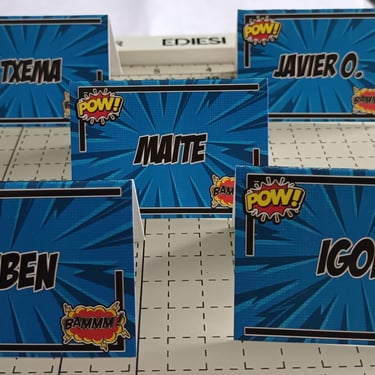 Por otro lado, siguiendo con la temática de los superhéroes, diseñamos un Seating plan poniendo de nombre de las mesas, los nombres de los superhéroes elegidos por ellos. Había una mesa que se llamaba incluso "Supermascotas" porque era la mesa de los amigos del parque de perros. Como podéis ver se hacen amigos por todos lados jeje.