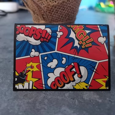 Por último y no menos importante creamos los marca sitios para que cada invitado supiera donde sentarse una vez llegado a la mesa. Lo diseñamos por delante y por detrás con estilo comic. Los pusimos encima de cada plato y cuando empezaron a comer, los pusieron delante de las plantitas que daban como regalo los novios a los invitados.