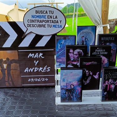 Allí mismo, les pusimos la mesa donde se situó el Seating Plan para que los invitados supieran en qué mesa debían sentarse. Fue algo que sorprendió a muchos. Se trataba de cintas VHS con la portada de cada película de Tim Burton elegida por los novios y en la parte de atrás se encontraban imágenes de la películas y los nombres correspondientes a cada mesa.