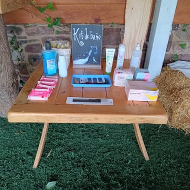 Tras darles la bienvenida, les hacíamos pasar debajo de una cabañita donde las mujeres podían ponerse los cubre tacones que facilitamos de diferentes tallas para mejor comodidad. Además, en la misma zona se podían ver los Kit de baños en autoservicio para los invitados y la zona chill out donde luego tendríamos una sorpresa para los invitados.