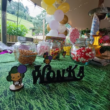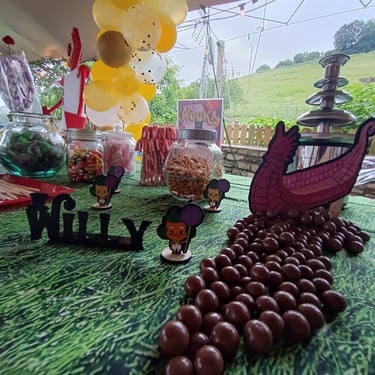 Pasamos a la parte del Candy Bar que fue tematizado con la película de Charlie y la fábrica de chocolate. Fue muy divertido montar todo el Candy Bar que luego encantó tanto a niños como a adultos. Pusimos decoración realizada en madera de Oompa Loompas y el barco de la películas. Hicimos un río con bolas de chocolate un poco fundidas para que no se cayeran.