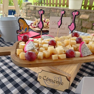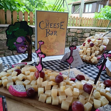 De allí pasaron a la zona de coctel donde les teníamos preparadas la zona de firmas y dedicatorias que consistía en un espejo y rotuladores para que los invitados dieran rienda suelta a su imaginación. También estaba el Cheese Bar solicitado por los novios y tematizado de Alicia en el País de las maravillas.