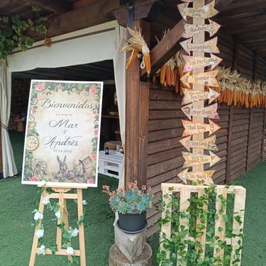Estuvimos esperando a los invitados en la estrada a la finca y les guiamos hasta el primer punto donde estaba el cartel de bienvenida y las flechas locas de dirección de Alicia en el País de las Maravillas.