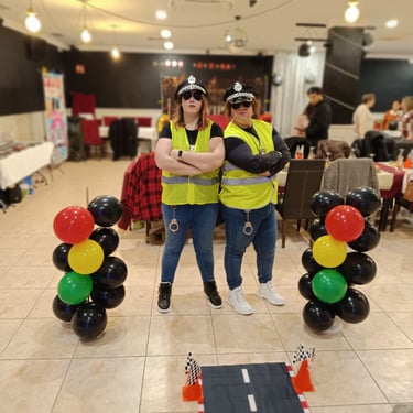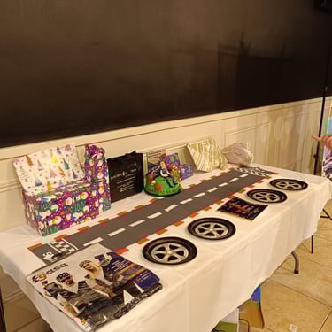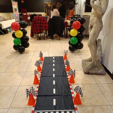 Cada rincón del local contaba algo sobre él. Desde semáforos de globos hasta una alfombra en forma de carretera, pasando por conos de tráfico con banderines de meta y platos con forma de rueda. Todo estaba pensado para rendir homenaje a su vida laboral en el mundo del transporte y a sus hobbies.