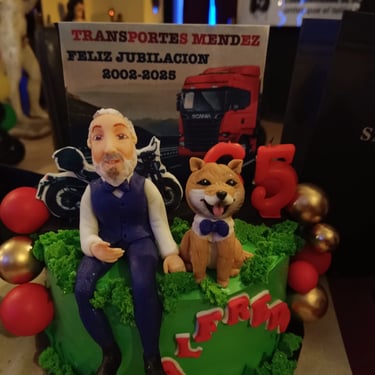 Después de disfrutar de una deliciosa comida en compañía de sus seres queridos, llegó el momento más dulce: la tarta. Pero no era una tarta cualquiera. En ella, Alfredo se encontró a sí mismo, representado en fondant, junto a su fiel shiba inu y un cartel con los años de su jubilación y el nombre de la empresa donde trabajó tantos años. Un homenaje en toda regla que le sacó una gran sonrisa.